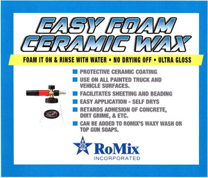 Easy Foam Ceramic Wax is versatile enough to be added to RoMix's Waxy Wash or Top Gun Soaps. This DOT non-regulated product is safe for all painted truck surfaces and won't harm glass or windshields, making application a breeze.
